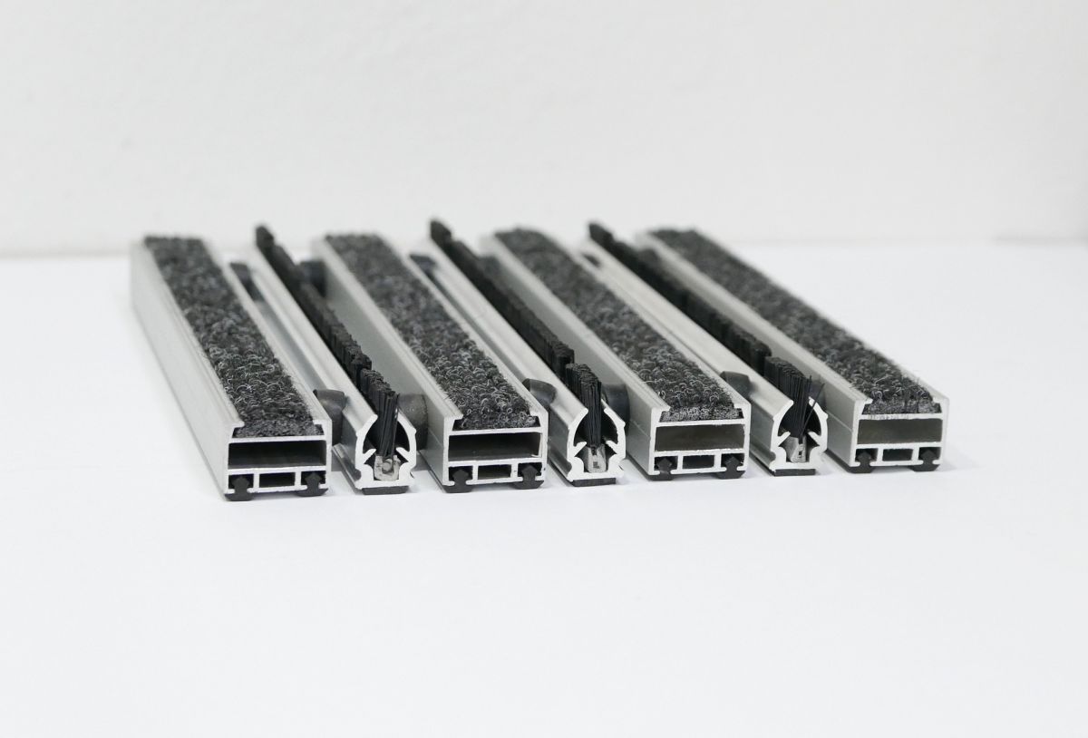 Sauberlaufmatten nach Maß mit Rips- und Bürstenleisten, aufrollbar und leicht zu reinigen. Stoppt Feinschmutz und saugt Nässe auf. Die Mini-Bürste entfernt effektiv starke Verschmutzungen. Hergestellt in eleganten 50-mm-Aluprofilen.