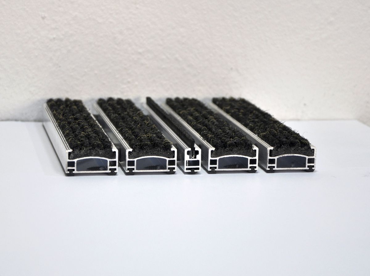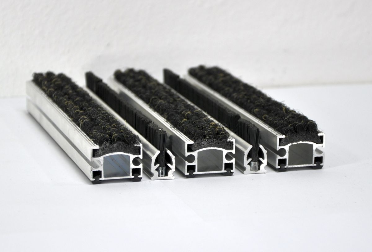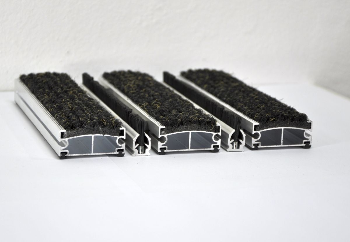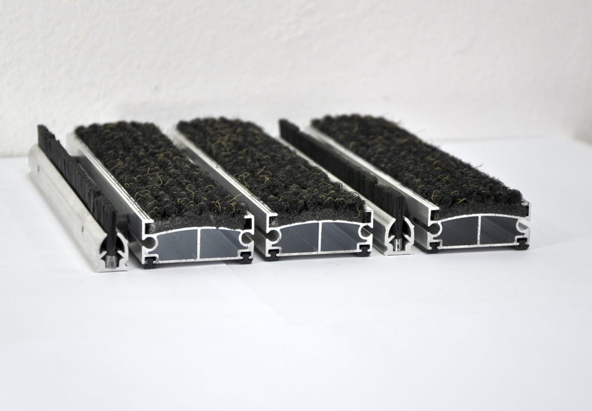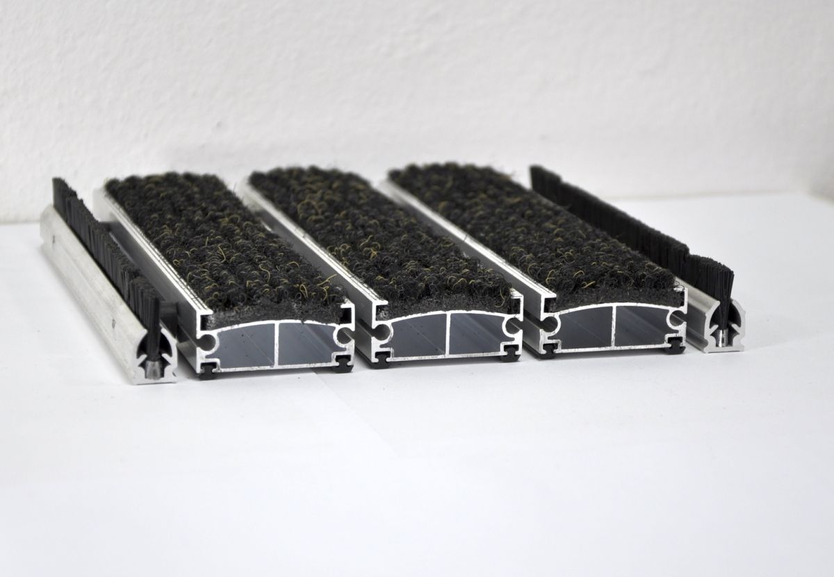 Aluprofilmatte mit Rips- und Bürstenleisten, aufrollbar und leicht zu reinigen. Stoppt Feinschmutz und saugt Nässe auf. Die Mini-Bürste entfernt effektiv starke Verschmutzungen aus dem Schuhprofil.