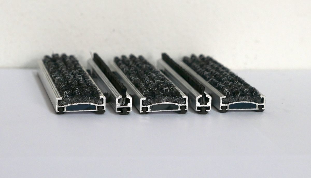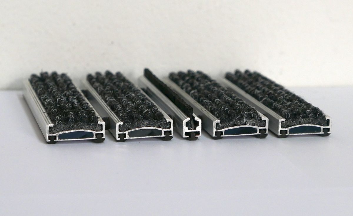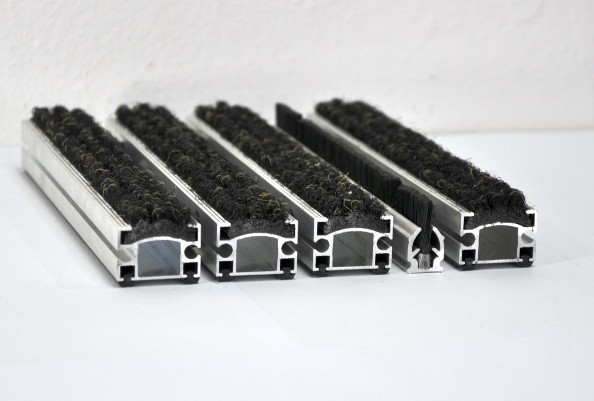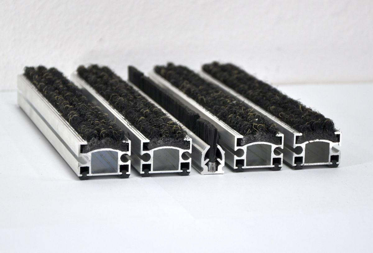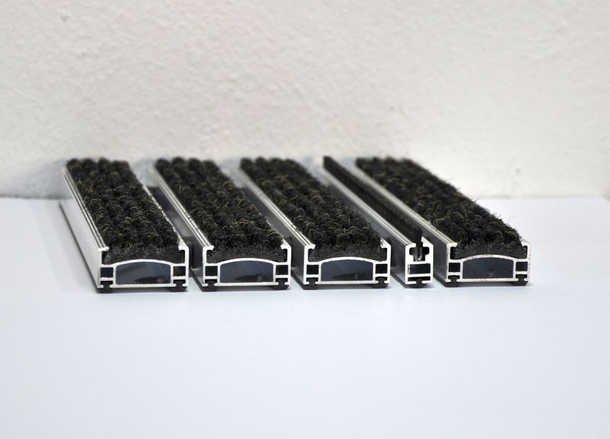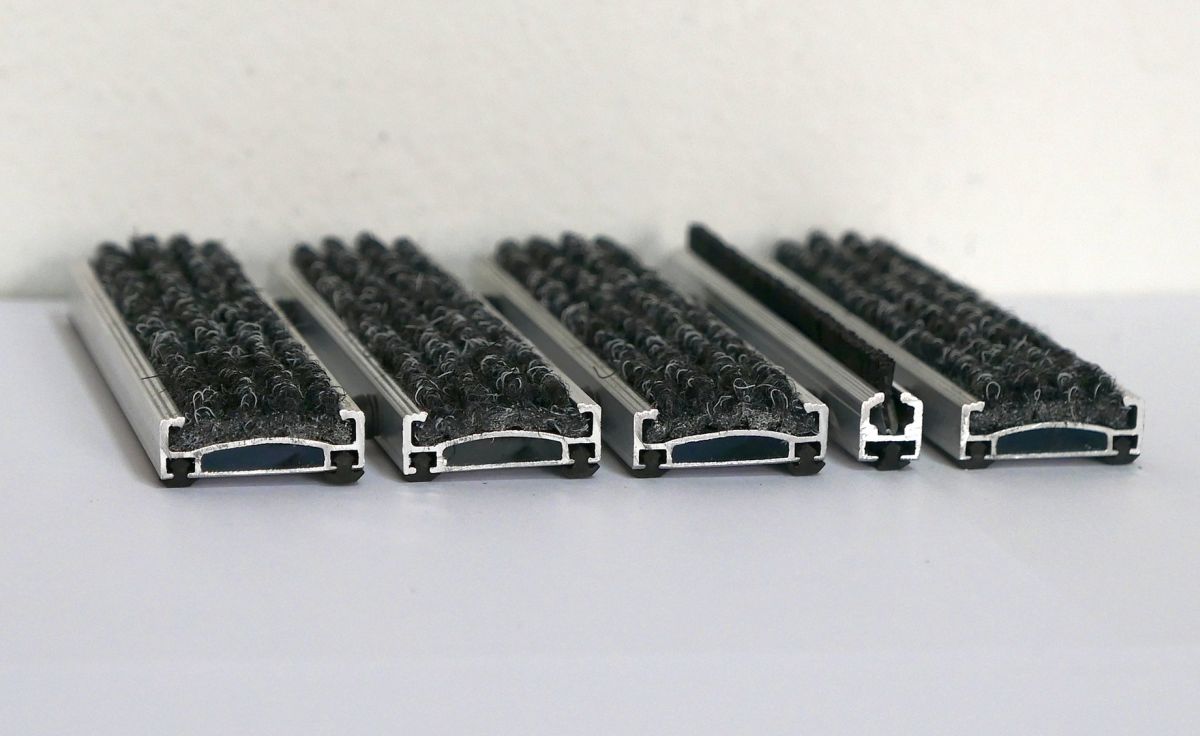 Aluprofilmatte mit Rips- und Bürstenleisten, aufrollbar und leicht zu reinigen. Stoppt Feinschmutz und saugt Nässe auf. Die Mini-Bürste entfernt effektiv starke Verschmutzungen aus dem Schuhprofil.